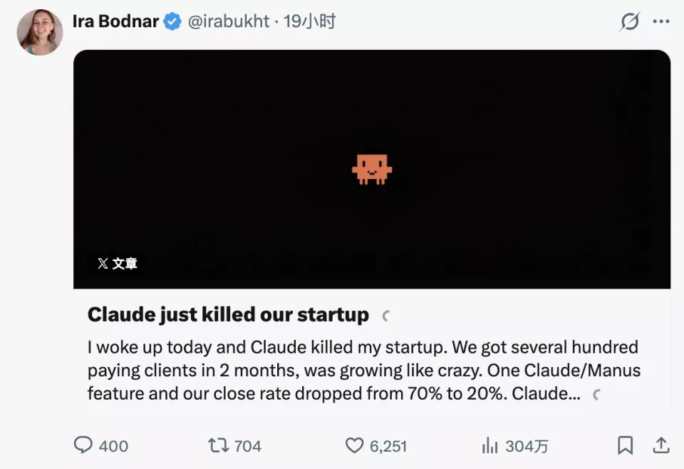 一位名叫 Ira Bodnar 的创业者在 X 平台发了一篇名为《Claude 杀死所有创业公司》的帖子,迅速获得了超过 300 万次阅读。