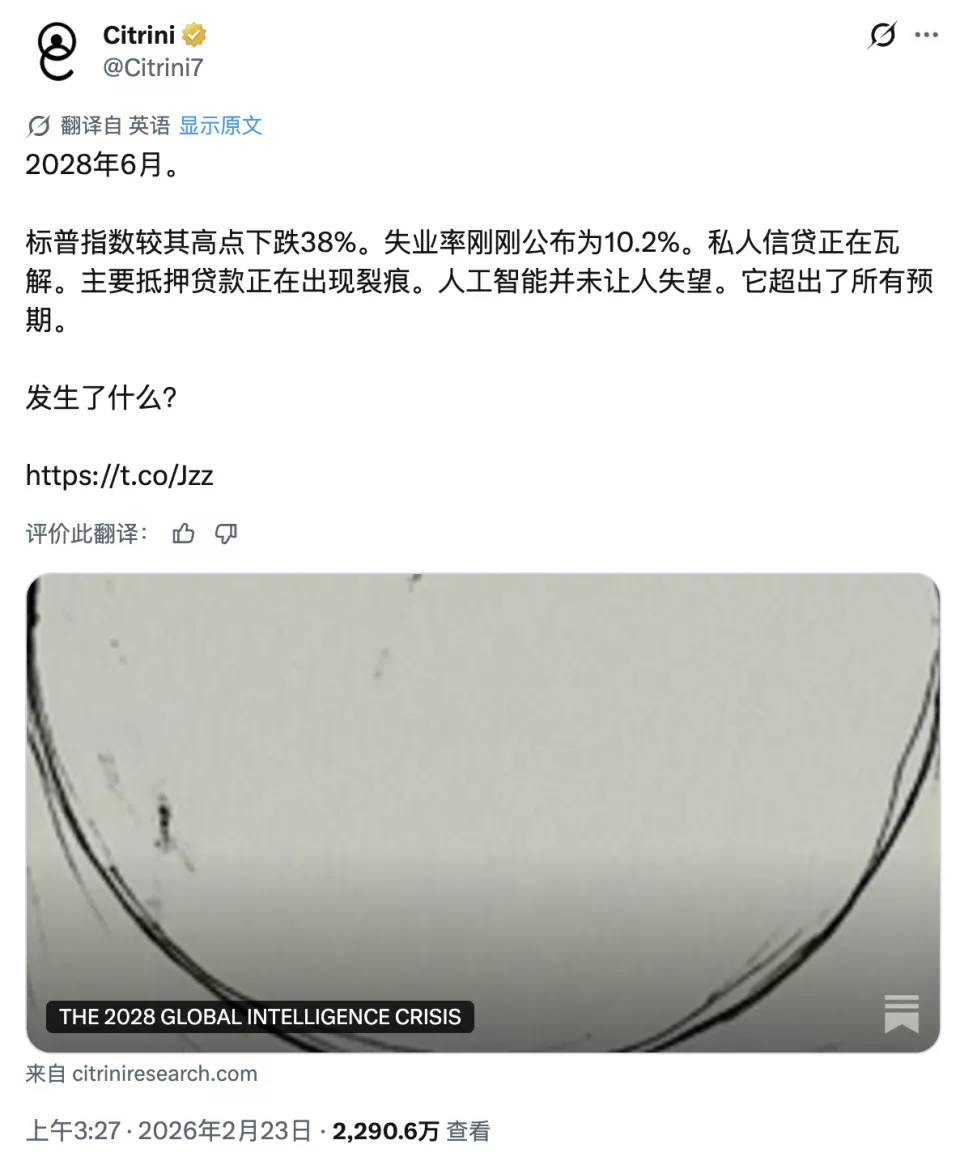 同样是在 IBM 暴跌的同期,一篇由 Citrini Research 发布的博客《2028 年全球智能危机》在 X 平台上火了,收获了 2000 万+的阅读量。