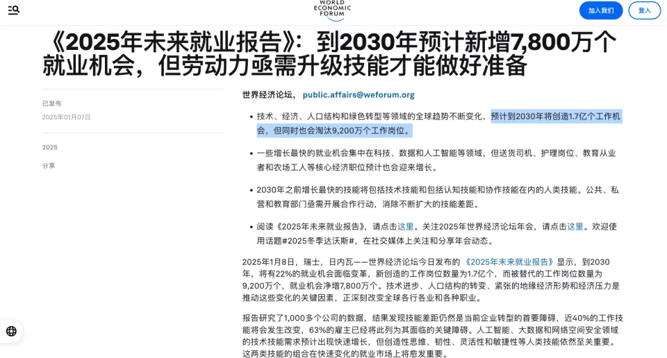 世界经济论坛预测,到 2030 年新技术净创造的岗位约 7800 万个,但这个再分配的过程,必然伴随大量摩擦和痛苦。