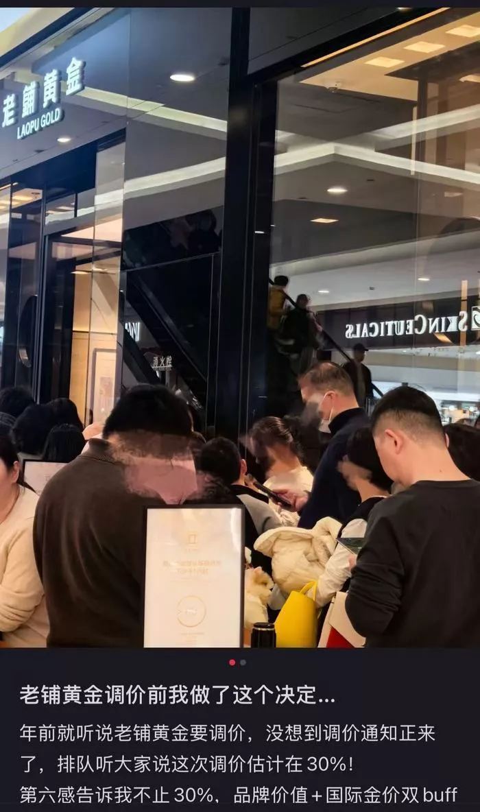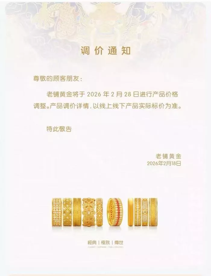 触发这波购金潮的,是一则简短的调价公告。2月18日,老铺黄金宣布月底启动年内首次调价。公告未披露具体涨幅,但市场预期在10%到15%之间。热门款式单价通常过万元,晚几天买,可能要多花几千元。