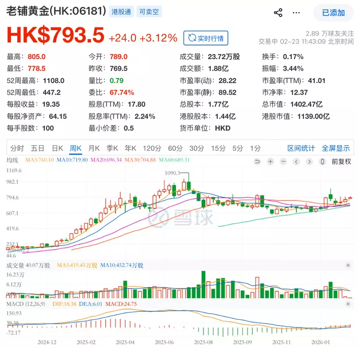 当线下销售持续火热,这家今年2月正式纳入恒生指数成分股的企业,也正面临资本市场更审慎的财务审视。二级市场的走势直接反映了这种多空博弈:受调价公告与线下抢购潮催化,老铺黄金(06181.HK)近期股价宽幅震荡,2月23日收报793.5港元,短期反弹,但距离去年超1800亿港元的市值高点仍有近三成的回撤。