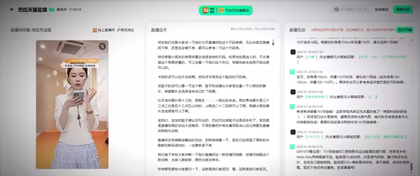 左边是一个实时的直播画面,中间是实时讲直播话术,右边是弹幕的互动观众的ID,包括他问的问题是什么。