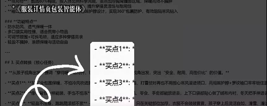 你看现在,它已经初步分析了买点一、买点二、买点三、买点四,还有一些使用场景,这是前面卖点分析在做的工作,文案策划现在开始转化买点。
