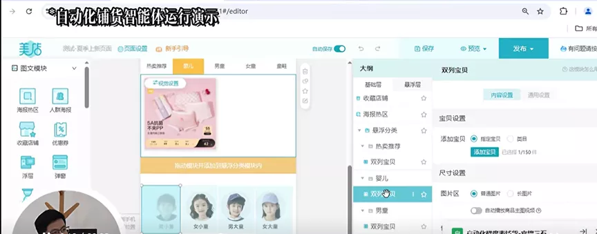 第四个场景是跟店铺装修相关的,比如说我们看到的店铺整个首页、二级页、分类页、专辑页里面的素材热区链接商品的陈列,这些也全部可以自动化。