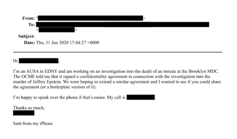 报道称,这封邮件日期为2020年6月11日,邮件中一名自称“AUSA in EDNY”——可能是“纽约东区联邦助理检察官”缩写——的人,提到了所谓“对杰弗里·爱泼斯坦谋杀案”的调查,“我是纽约东区联邦检察官办公室的助理检察官,目前正调查布鲁克林区大都会拘留中心一名囚犯的死亡事件。”邮件中写道。报道提到,美司法部已将发件人和收件人的信息均隐去。