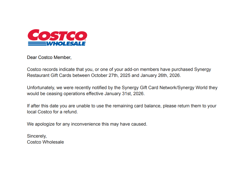 Costco向在2025年10月27日至2026年1月26日期间购买过Synergy Restaurant Gift Cards的会员发出通知信,告知该批礼品卡已不再可兑换。