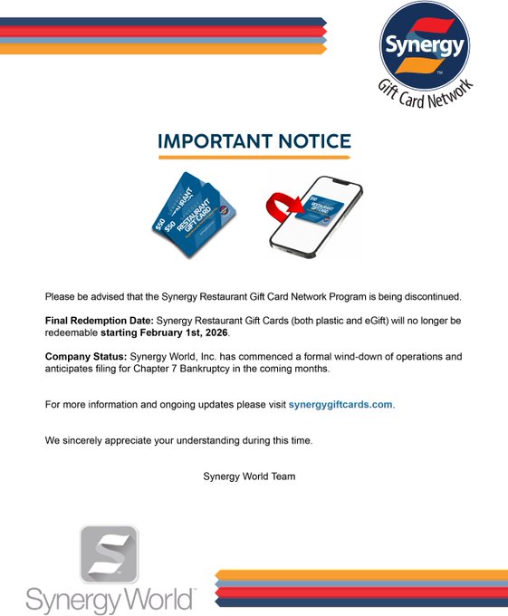 信中写道:“遗憾的是,我们最近接到Synergy Gift Card Network/Synergy World通知,该公司将自2026年1月31日起停止运营。”