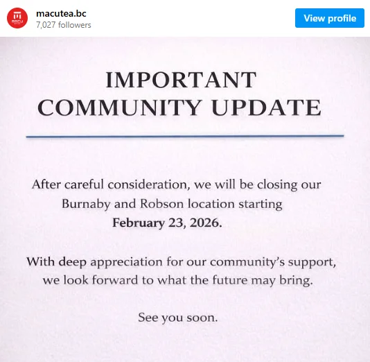 “经过慎重考虑,我们将从2026年2月23日起关闭Burnaby和Robson门店。非常感谢社区一直以来的支持,我们期待未来的可能性。”