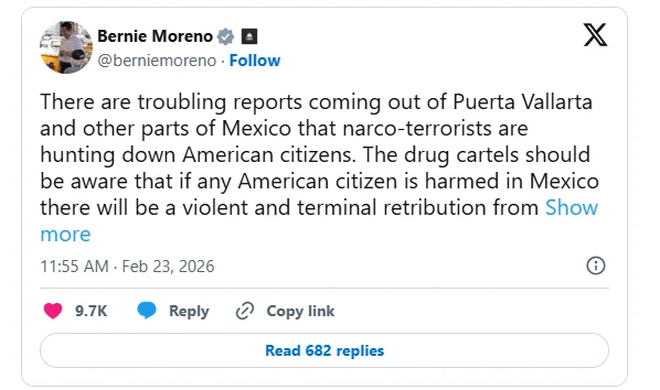 参议员伯尼·莫雷诺(Bernie Moreno)周一在 X 网站上撰文称,美国应该停止贸易谈判,并警告说,如果任何美国人在墨西哥受到伤害,将会遭到“暴力和致命的报复” 。