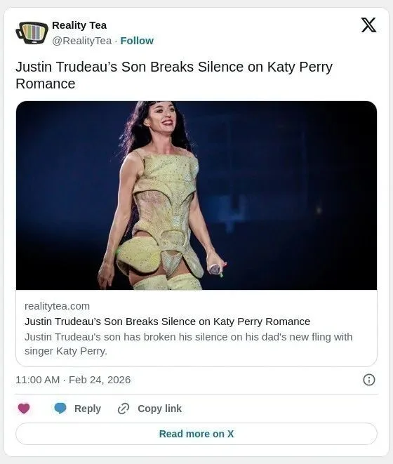 凯蒂与特鲁多自2025年夏天开始交往。两人去年在加拿大被拍到共进晚餐,恋情首次浮出水面。随后互动频繁——特鲁多被目击在凯蒂的演唱会上“爸爸式”热舞,两人多次一同度假,并在社交媒体上公开关系。