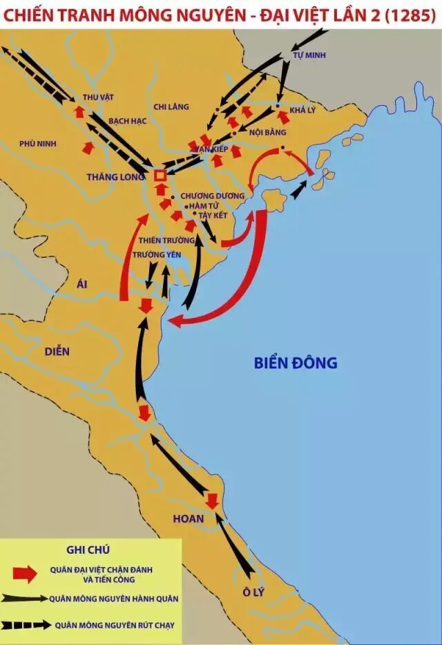 虽然类似的战略在1285年已经进行了预演,但当时的元朝各路军都在事先没有统一的战略规划。只是忽必烈还是忽略的一个重点,陈朝并不是南宋那样的纯中央吏制帝国。南宋在襄阳和临安失守后,就基本上失去了全局层面的军事组织能力。但陈朝皇帝并不依赖升龙城这个表面上的单核。倒是蒙古人更喜欢依据旧思维,将其作为自己征服越南的主要基地。