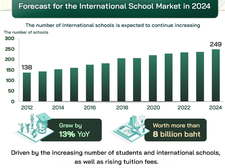 在2012-2024年的这12年里,泰国国际学校数量年均增加5.0%,截至2024年已有近250余所。
