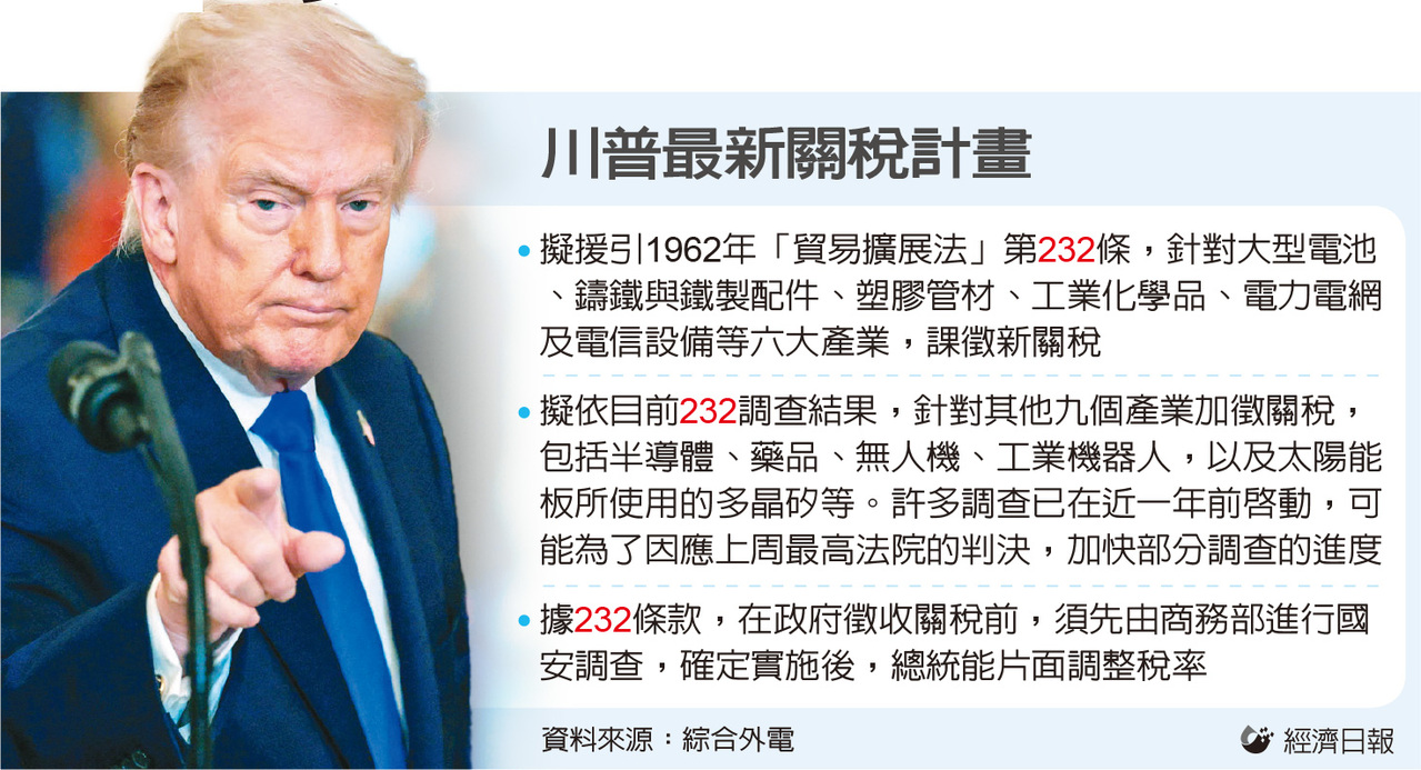 川普政府也已考虑根据目前232调查结果,针对其他九个产业加征关税,包括半导体、药品、无人机、工业机器人,以及太阳能板所使用的多晶矽等。许多调查已在近一年前启动,政府可能因应上周最高法院的判决,加快部分调查进度。