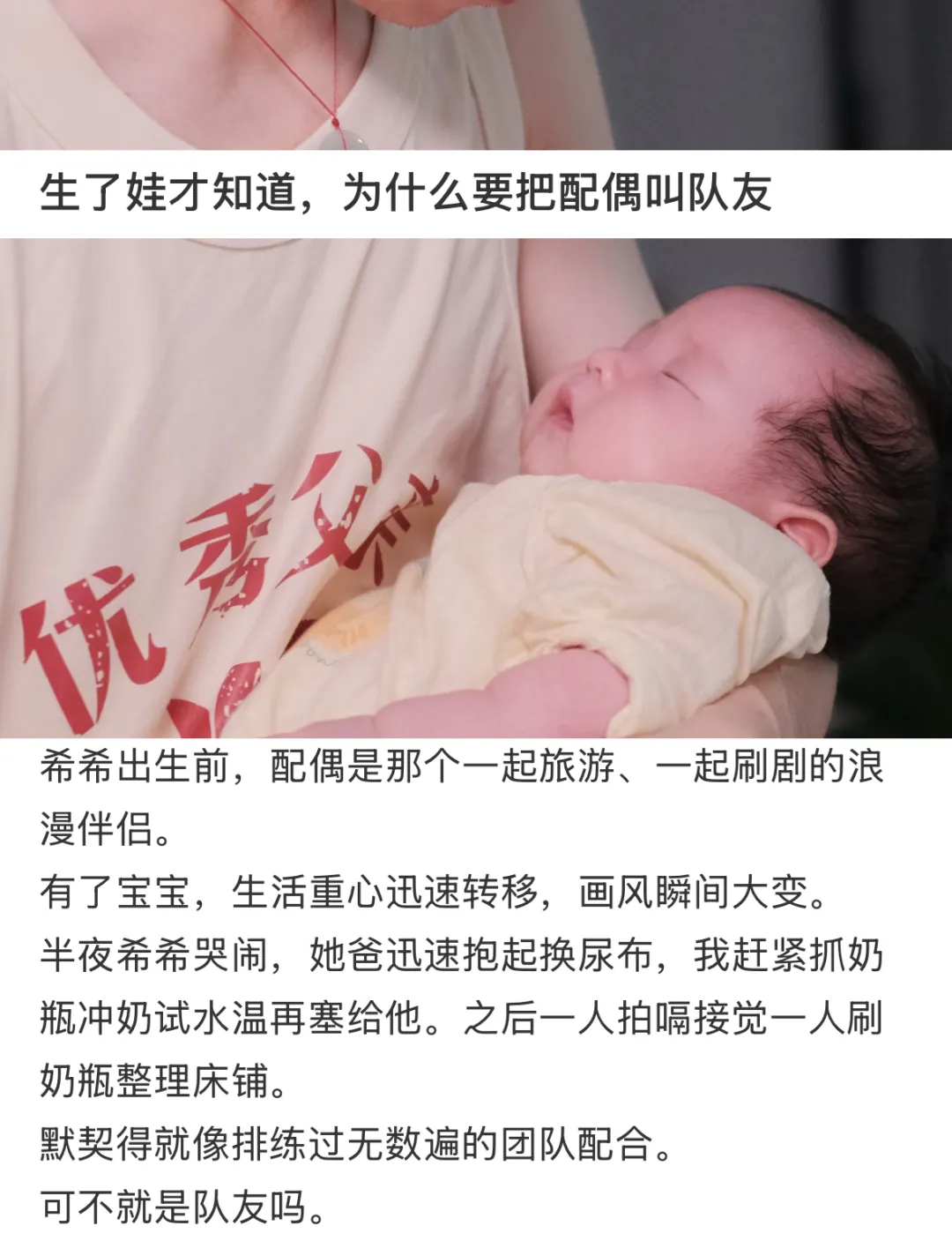 “生了孩子才明白,能管配偶叫队友,简直是最高的赞许。我烧饭你洗衣,我生娃你带娃,在琐碎的家庭分工中,才能检验出对方的人品。”