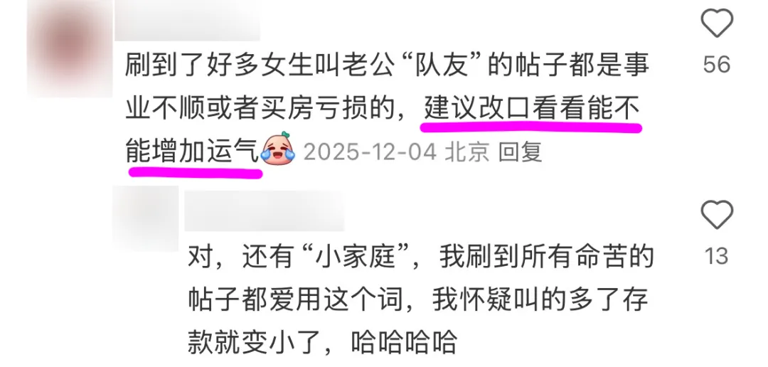 起初,队友一词没有任何暗戳戳的隐喻,只因为叫其它的,太拗口了。“大家都是头一回结婚,在外面叫老公/老婆好肉麻,叫爱人太老派,叫伴侣实在文绉绉,叫我先生/夫人更烫嘴……”