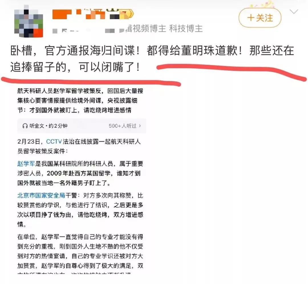 早晨醒来,有人私信给我说,你需要给董明珠大姐道歉,而后甩给我一个报道链接。报道说的是某航天科研人员留学被策反的事情,就是到国外留学然后就被盯上了,请吃饭请吃烧烤然后泄密了,现在被判了七年。