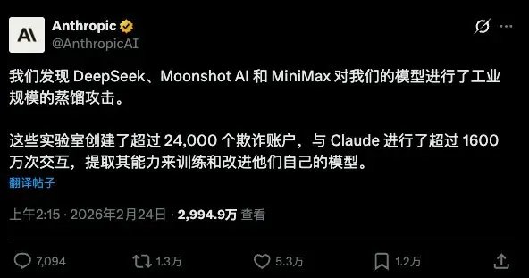 内容大意是说,他们发现了三家中国AI公司,分别是DeepSeek、Moonshot(就是Kimi的母公司)和MiniMax,对Claude进行了"工业规模的蒸馏攻击"。