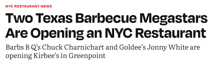 近日,德州烧烤界的顶级团队正式宣布,将在布鲁克林绿点区(Greenpoint)开设名为Kirbee’s的全新餐厅。这并不是一次普通的扩张,而是德州烧烤界三股最强力量的“梦幻联动”: