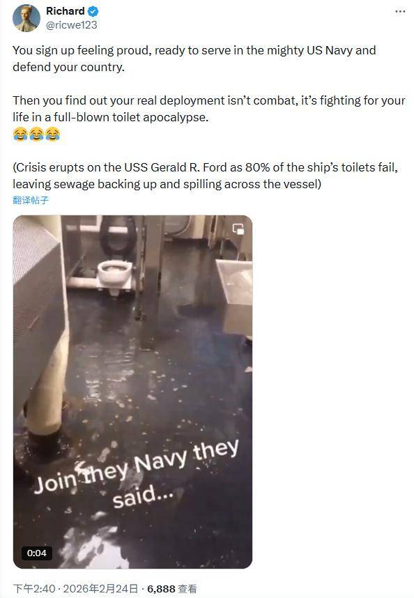 据美国《海军时报》此前报道,“福特”号航母上的厕所长期存在管道问题。美国国家公共电台(NPR)发布的一份报告称,自2023年以来,“福特”号已因厕所问题请求协助42次,其中仅2025年就占有32次。有美媒称,目前该舰上约有4500名士兵,加重了厕所问题的严重程度。NPR获取的内部邮件显示,水兵们抱怨每次如厕都需要排队45分钟。 有网友在社交媒体发帖吐槽称,报名参军时是为了保家卫国,结果是一场“关乎生死存亡的厕所之战”,并配有疑似舰上厕所污水横流的视频。