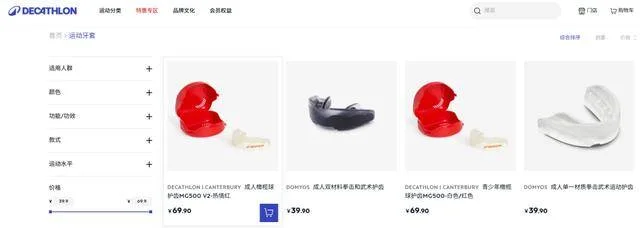 从各家官网看,成品护齿器的价格并不昂贵,定价均在100元至300元之间。甚至,在迪卡侬39.9元就能买到基础款。