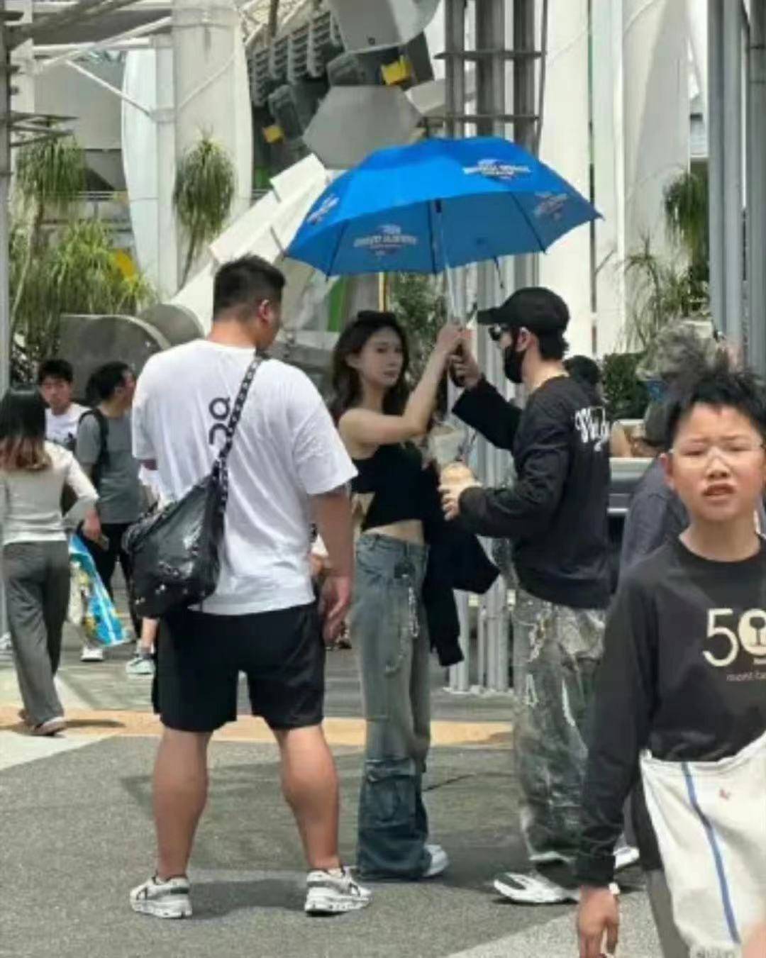 黄晓明身穿黑色休闲装,头戴棒球帽,口罩遮面,身旁女子长发披肩、皮肤白皙、身材高挑(约170cm以上),身穿黑色露脐上衣与宽松牛仔裤,整体穿搭风格与黄晓明高度一致,被指疑似“情侣装”。两人全程共撑一把伞,黄晓明多次主动为女方遮阳、拿小吃,撑伞时手臂贴近,肢体距离近,未刻意回避镜头,状态放松自然。现场有助理随行,但行程偏向私人化,更显亲密氛围。