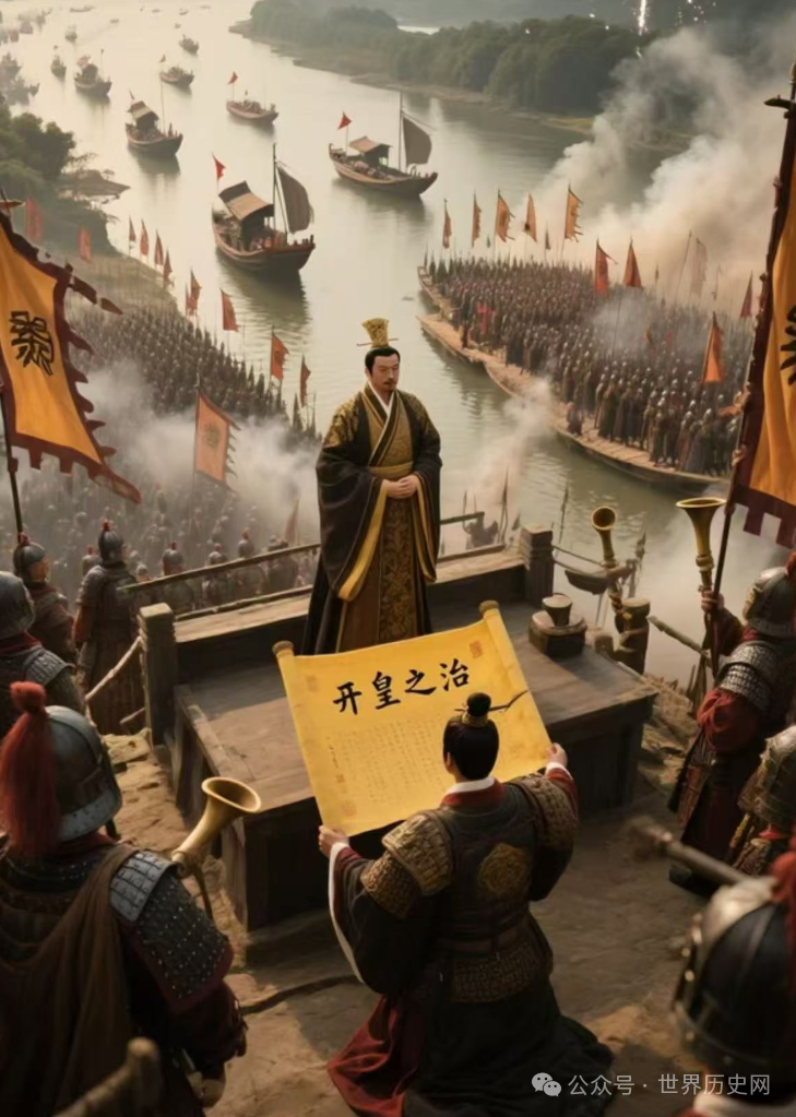 589年,隋文帝命次子杨广(后为隋炀帝)为统帅,南下灭陈,终结自东晋以来近300年的南北分裂,实现中国再度统一。