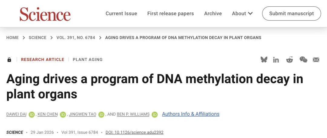在小小的模式植物拟南芥中,戴大伟发现并解释了一种和人类高度相似的表观遗传衰老机制。这篇于2026年1月29日在线发表于Science的研究,除了戴大伟和导师Ben Williams,仅有一名研究生和一名本科生参与。