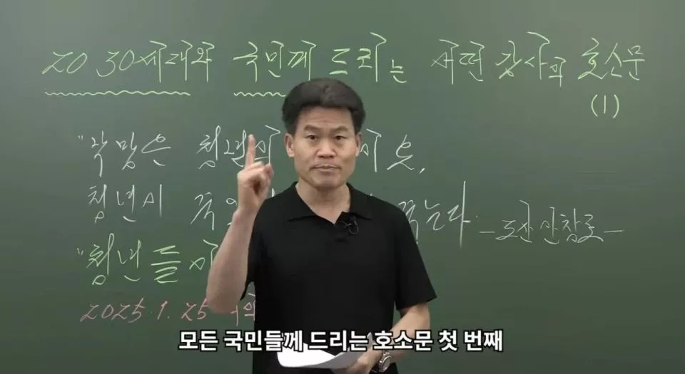 这个长着小眼睛、国字脸,剪了一头短发的男人,站在黑板面前,拿着麦克风侃侃而谈。网名音译为“全韩吉”(韩语名为“전한길”)的他,原本是一个不起眼的历史补习老师,如今成了油管上粉丝最庞大的韩国政治播客主之一。