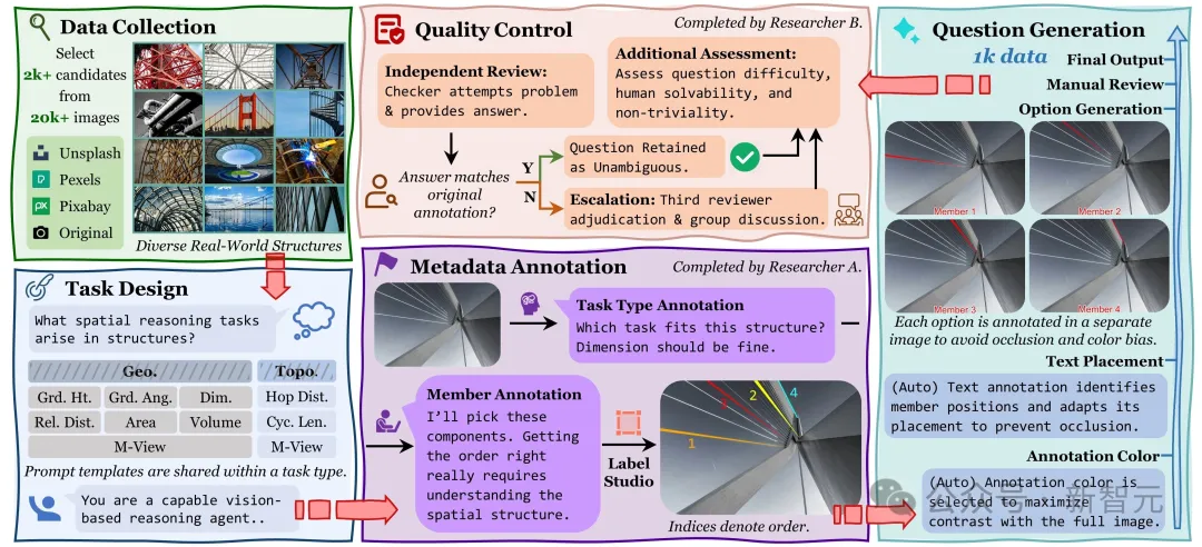 为了保证数据集的质量与多样性,同时也由于缺乏真实结构构件的标注数据,SSI-Bench的构建流程非常「硬核」——10位研究者投入超过400小时,从大量真实结构图片中进行人工筛选与题目设计: