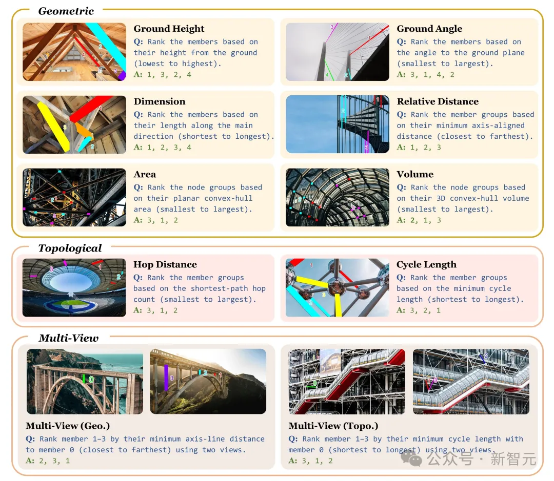 SSI-Bench不再让模型做选择题,而是统一成排序任务:每题给出3或4个候选「构件/构件组」,要求在指定几何/拓扑准则下输出正确的全排列顺序。