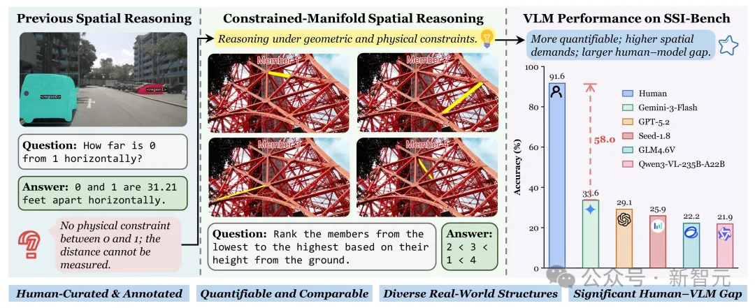 SSI-Bench系统评测了31个主流VLM,结论非常直接:人类几乎「碾压式领先」。