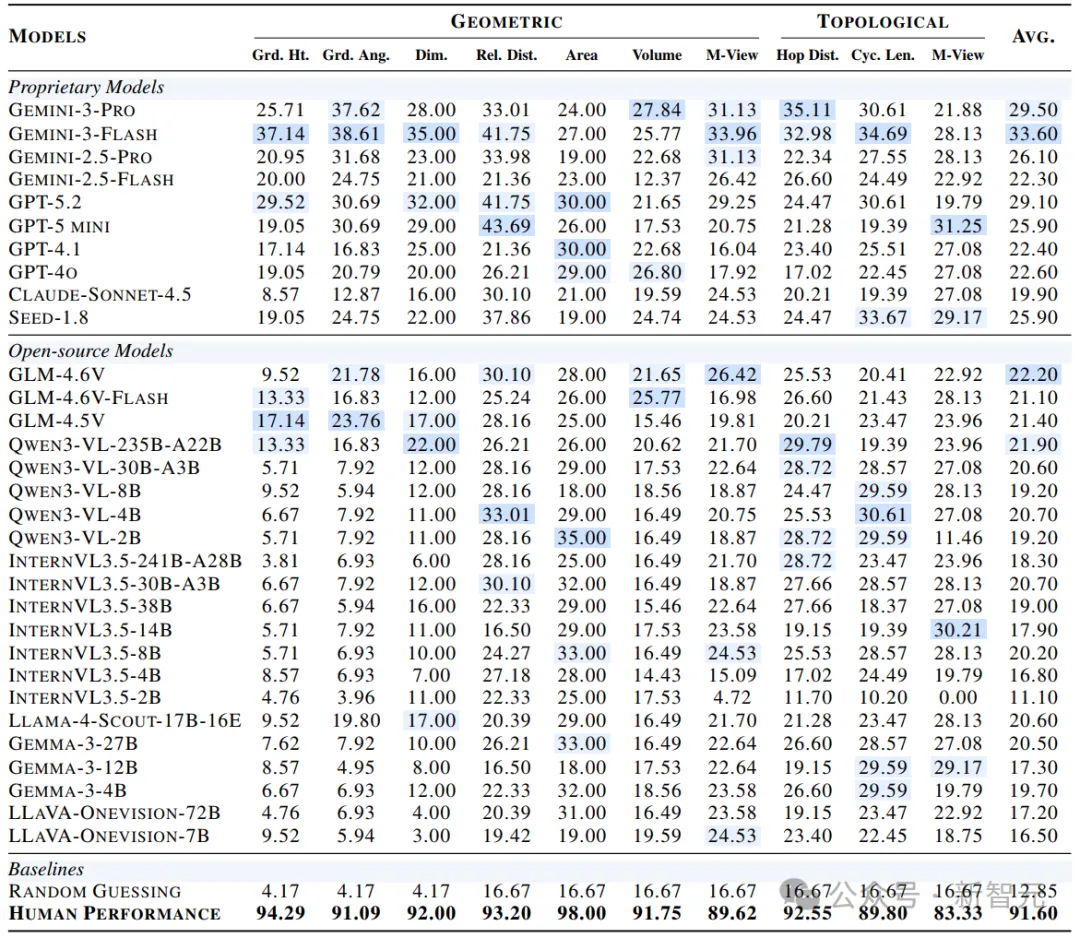 人类平均91.6%,最强闭源33.6%(Gemini-3-Flash),最强开源22.2%(GLM-4.6V),随机猜测基线12.85%