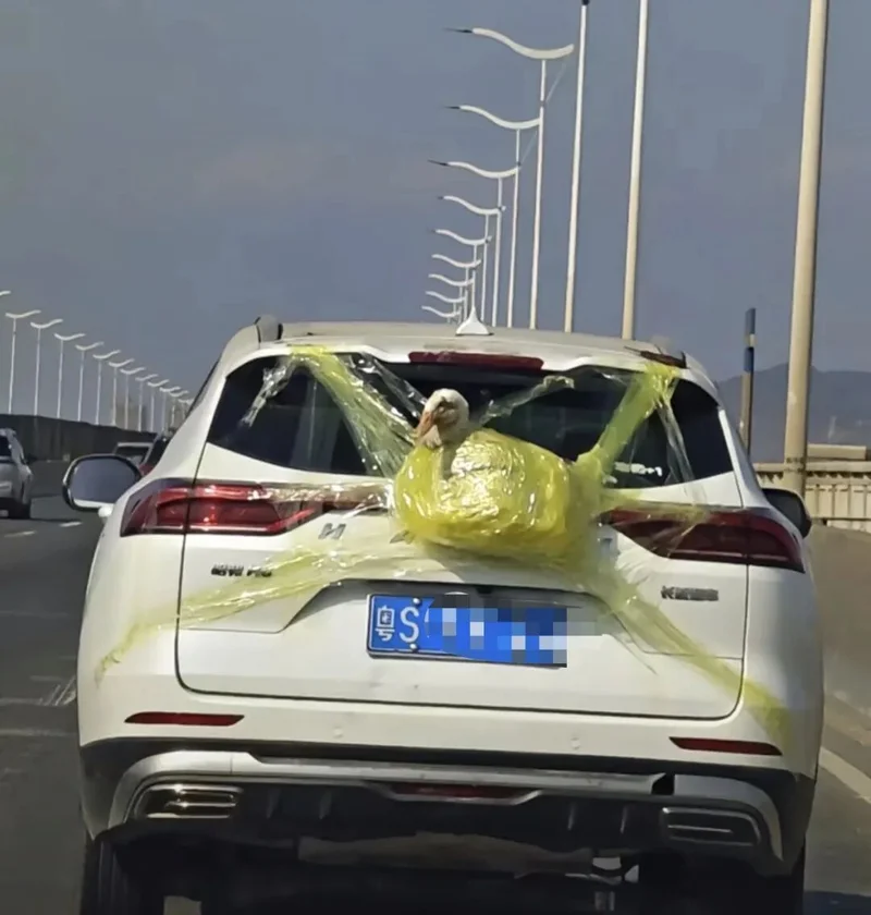 一位网友因为把鸭子挂在车尾,还没到目的地,半路被追尾,鸭子默默扛下了一切。