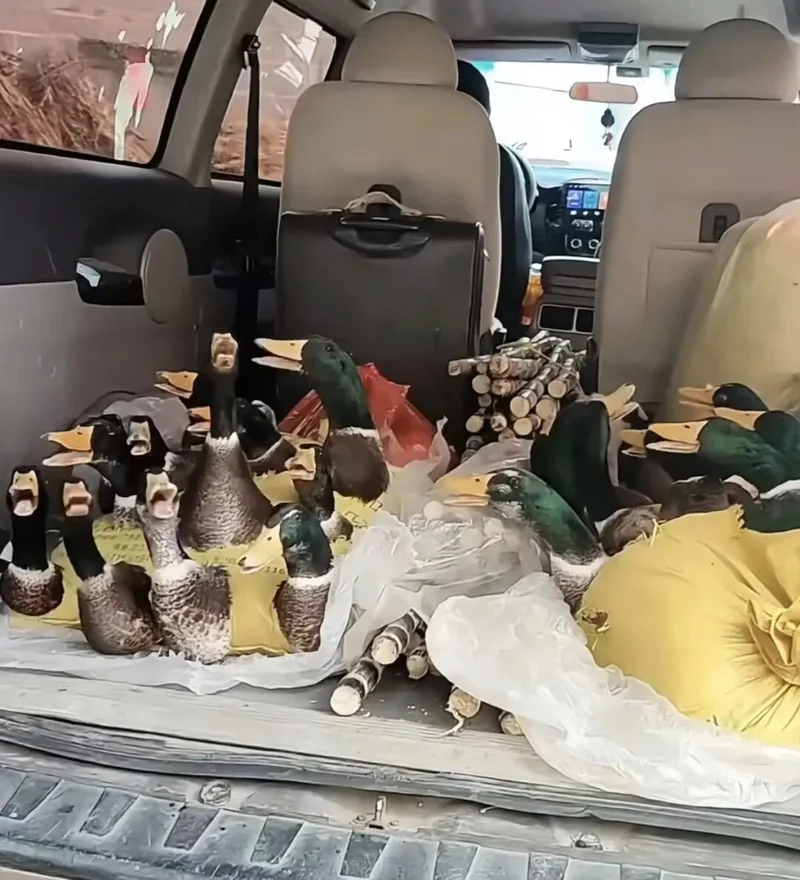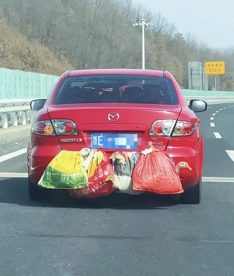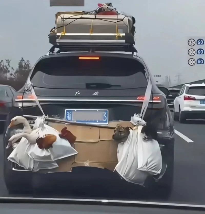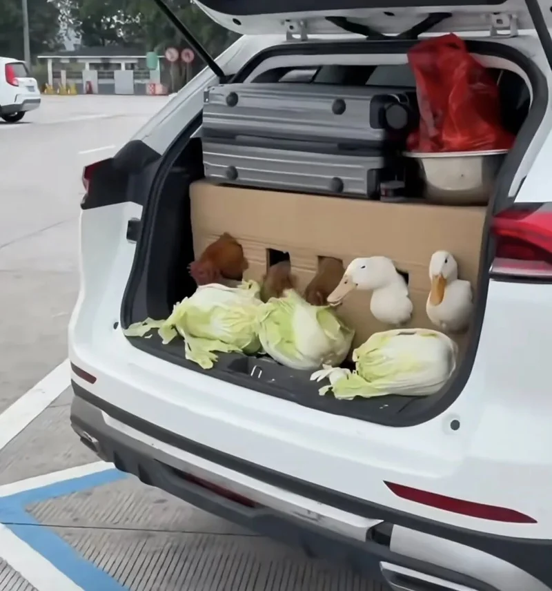 一位离乡者干脆把后备箱设计成了禽类豪华房车,直接将他爸妈的鸡鸭圈进行整体平移,就是几百公里路下来,车里凝固着一股半永久鸭屎味。