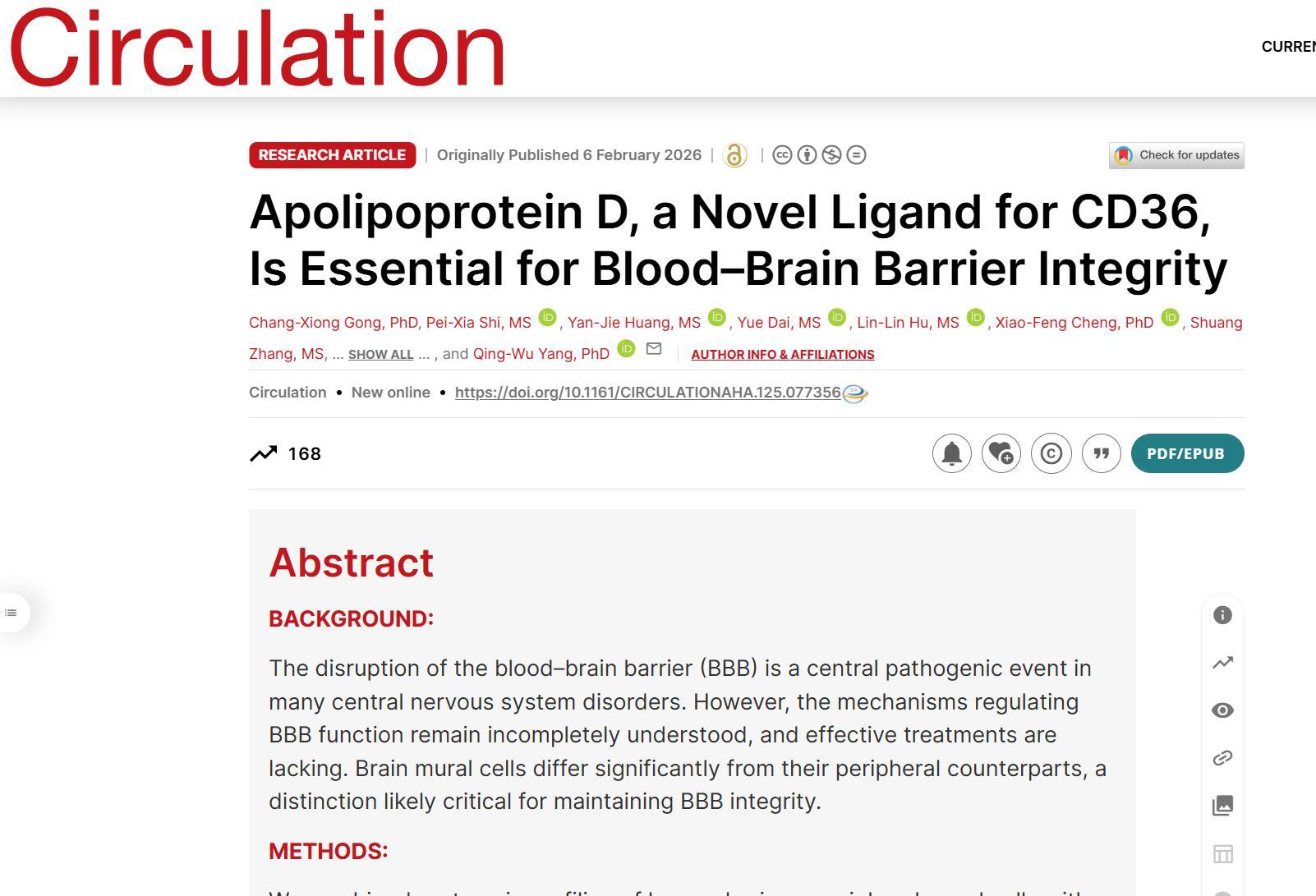 2月25日,记者从陆军军医大学新桥医院获悉,该院杨清武教授团队在国际心血管领域顶级期刊《循环》上在线发表最新研究成果。该成果首次发现人体内一种名为“载脂蛋白D”(ApoD)的物质,能够有效抑制导致血管损伤的关键因子CD36,从而保护血脑屏障的完整性,促进脑卒中后的修复。该研究为脑卒中及其他心脑血管疾病的机制研究与精准干预提供了新的理论依据。