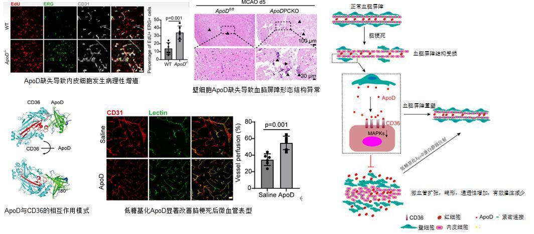 杨清武教授团队经过深入研究,终于找到了这个重要的“守护者”——载脂蛋白D(ApoD)。研究发现,ApoD能够直接“抓住”CD36,有效抑制其“煽风点火”的行为,从而保护大脑血管屏障的稳定性。“这就像给破坏分子配了一个‘监督员’。”杨清武教授形象地解释说:“CD36长期被视为促炎促损伤的坏角色,而我们首次发现人体自身产生的ApoD能有效抑制其有害作用。”为了验证ApoD的保护作用,研究团队进行了系统的动物实验。