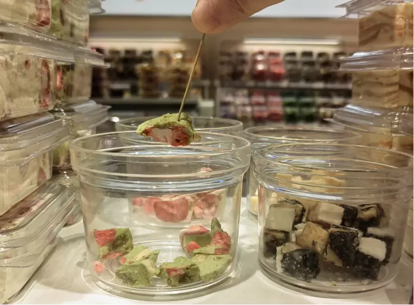 只要你脸皮够厚,可以把每样产品都试吃个遍,对于那些没有摆出小样的产品,你也可以大胆地询问店员:“这个能试吃吗?”这时店员会套上塑料手套,从一大袋果仁或菌菇脆里面挑出一两个给你尝。