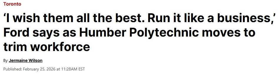 Humber在给CTV News的声明中证实了这一计划,并表示尽管获得了省政府资金支持,学院仍面临“异常严峻的预算和财政压力”。