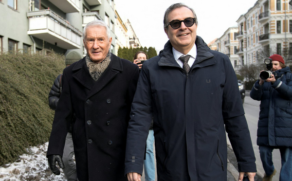 调查人员2026年2月12日搜查挪威前首相亚格兰(Thorbjorn Jagland)的居所,亚格兰(左)与代表律师在现场离开(NTB/Stian Lysberg Solum via REUTERS)