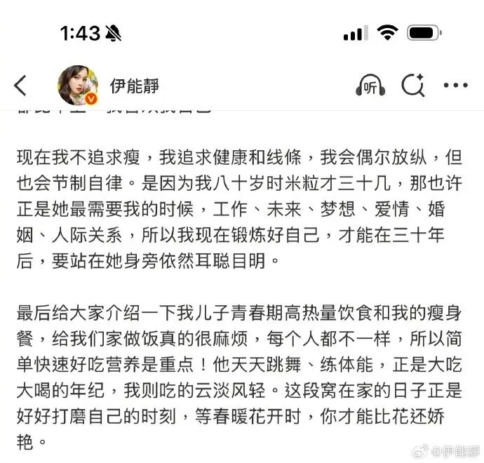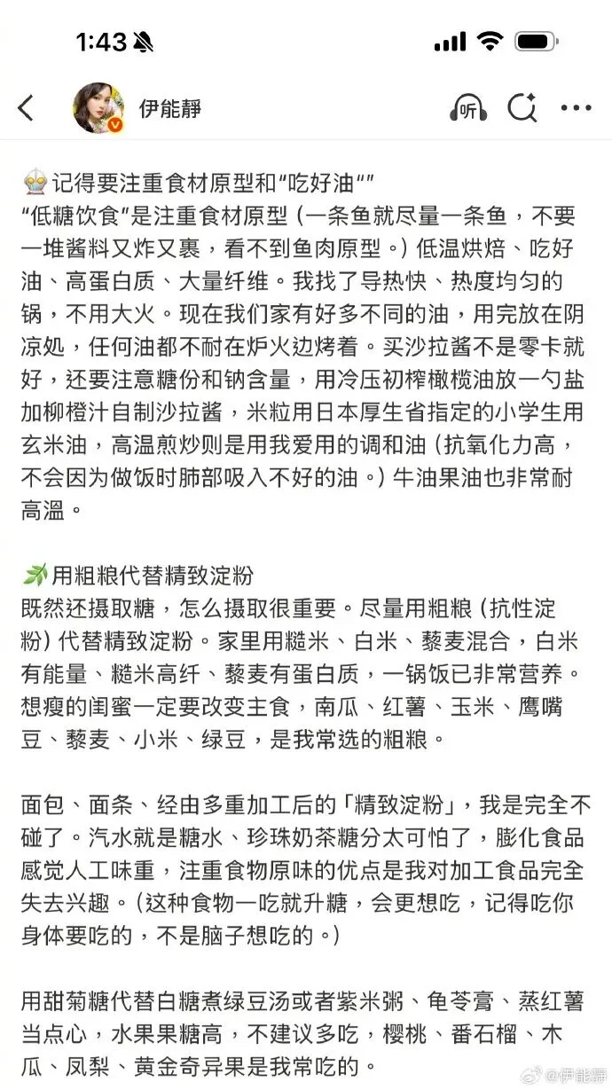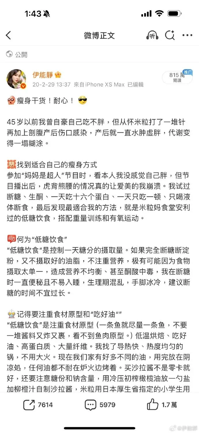 2月25日,伊能静在社交媒体发文回应,曾执行过半年生酮饮食,全文如下: