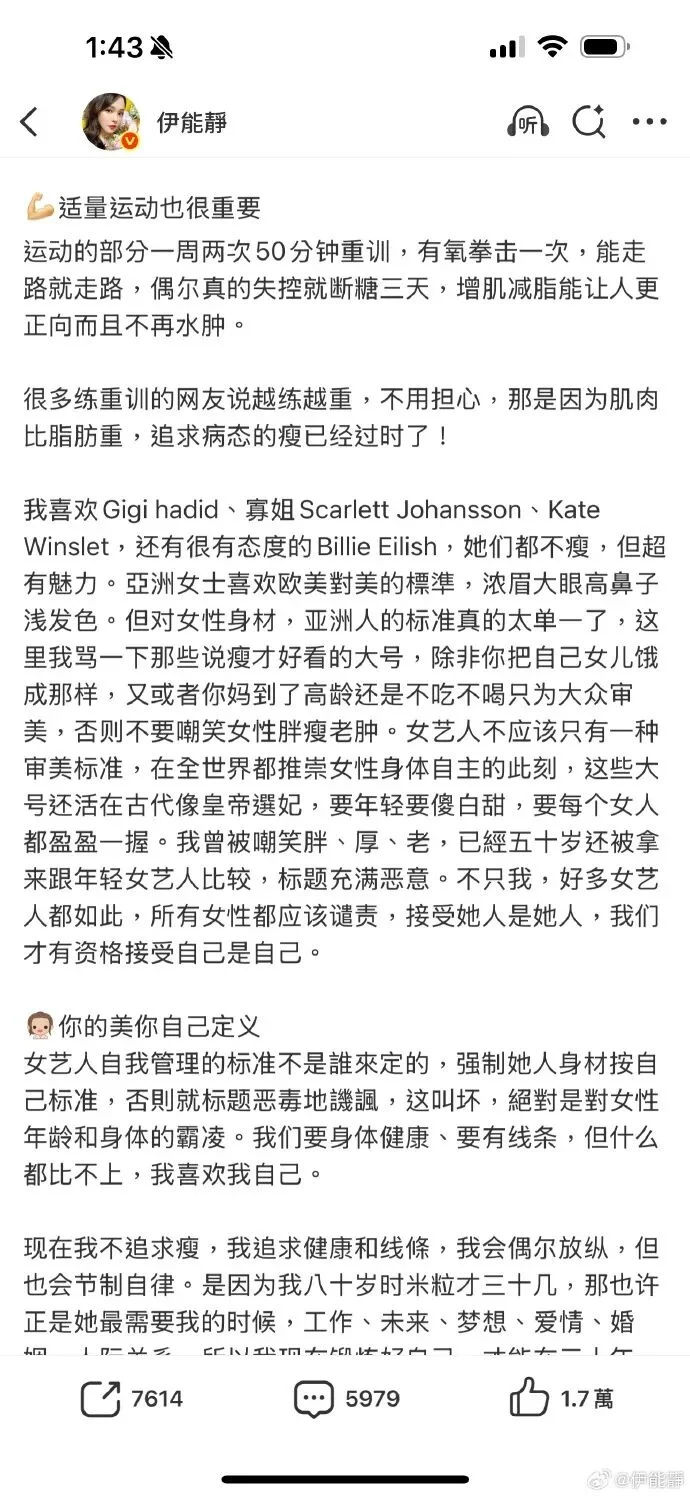 不提倡身材焦虑,每个女人都有她的美,每一种身材只要健康都应该被自己欣赏。 但是女艺人的工作美是一部分,给大家看到自己的好状态,也是我对工作的责任。