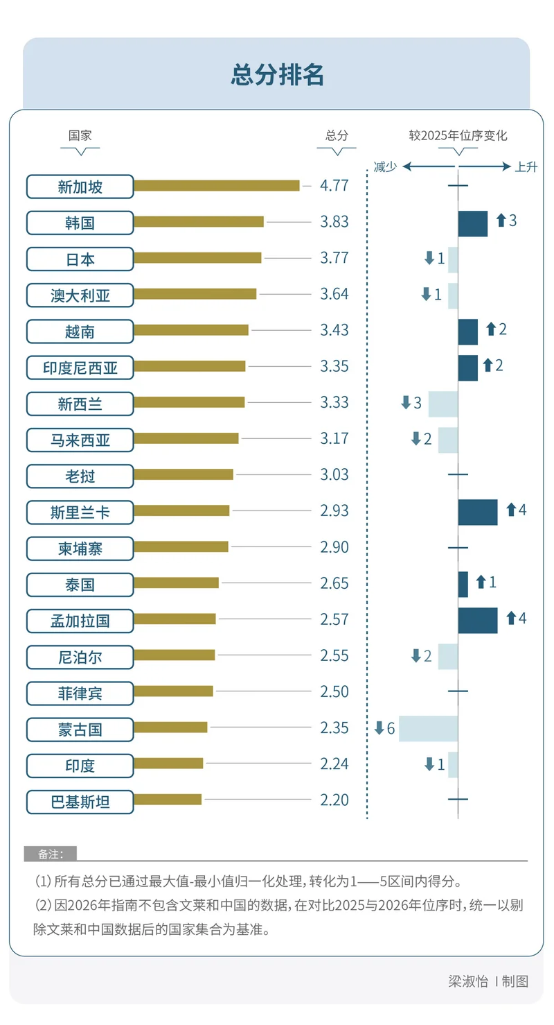 2026年指南总分结果中,越南、斯里兰卡、蒙古国的排名位序较2025年出现显著变化。