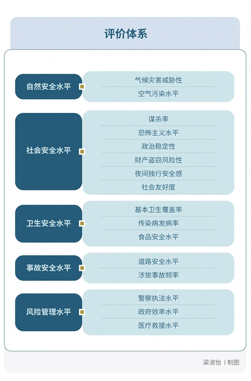 除“卫生安全水平”以外,新加坡在4项一级指标中均位列第一,并在“道路安全水平”等10项二级指标中拥有领先优势。可控的社会暴力、先进的医疗条件、稳定的气候环境、高效的治理水平发挥协同效应,构筑了新加坡强韧的安全屏障。