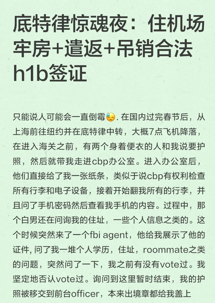 近日,一名持H-1B工作签证的华人,回国过春节年初四返回美国时,却在入境处被关小黑屋,之后更是被吊销签证,并遣返回国。