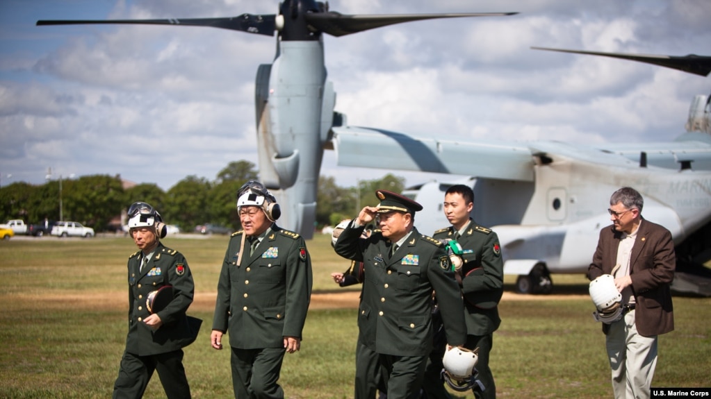 资料照片:2012年5月9日,时任沈阳军区司令员张又侠(左三)陪同中国国防部长梁光烈上将(左二)访问北卡罗来纳州勒琼营海军陆战队基地。
