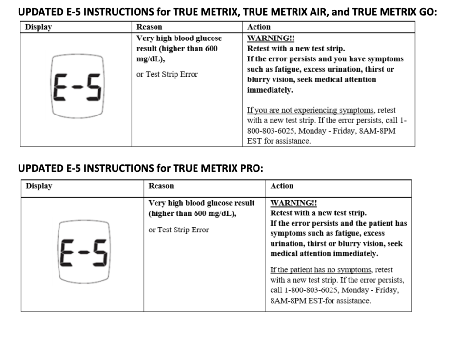于是,今年2月6日,Trividia Health已经向患者发布公开信,修正这长达十余年的指引疏漏,明确“E-5错误码”代表“高于600mg/dL的极高血糖水平”,并提示:“如果错误码持续出现,并且患者存在疲劳、多尿、口渴、视力模糊等高血糖症状,需立即就医采取临床干预。”