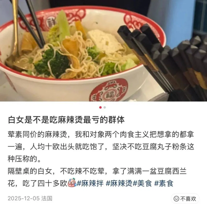 “如果说上一代老外对中国美食的认知停留在左宗棠鸡,那纯属是装懂。真正懂行的,早已跳进了麻辣烫的深水区,每天都在琢磨杨某福的汤底更醇厚,还是某亮的麻酱更地道。更有一些老外,甚至开始爱上刘某祥的东北黏糊感了。”