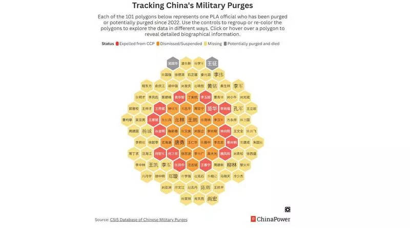 CSIS昨日公布报告指出“中国军方内部的清洗比你想像的还要深入”,并发布一张“追踪中国军方的肃清行动”(TrackingChina's MilitaryPurges)的蜂巢图,只见多达101个多边形中,每一单元就代表一名落马的高官,多边形图案上的颜色也有差异,红色代表被开除党籍、橘色代表被停职/撤职、黄色代表失踪、灰色代表已被肃清或死亡。