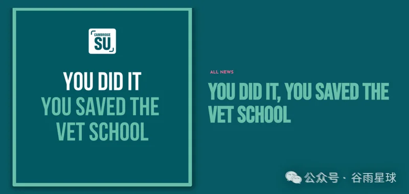 剑桥大学学生会官网大幅海报:「我们成功挽救了兽医学院。」