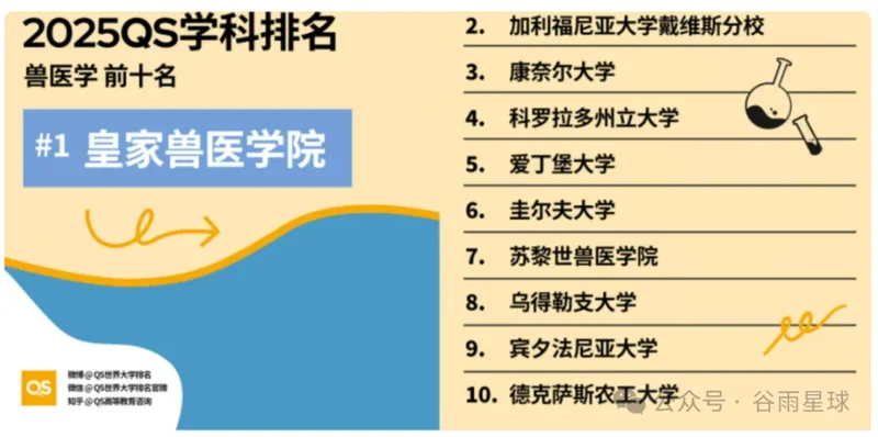 2025年QS世界大学学科排名中,兽医专业的前十名分布在全球各地。